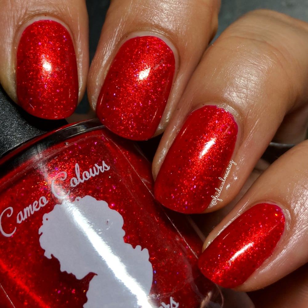 A vibrant, orange leaning fiery red, full of red/gold/green shifting shimmer and holo micro flakes.